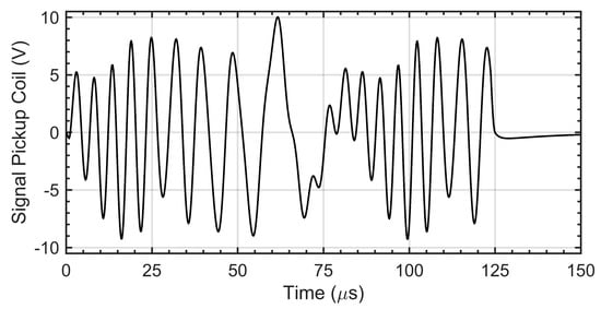 In the time dependent simulation, the pulse described in Section 2.2 was used as the feeding voltage for excitation coils. The pulse duration was 125 μs, and the entire simulation time was 150 μs, with time step not larger than 0.20 μs. The voltage waveform on the pickup coil was saved for further analysis. An example of the signal achieved from the pickup coil is shown in Figure 12.