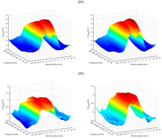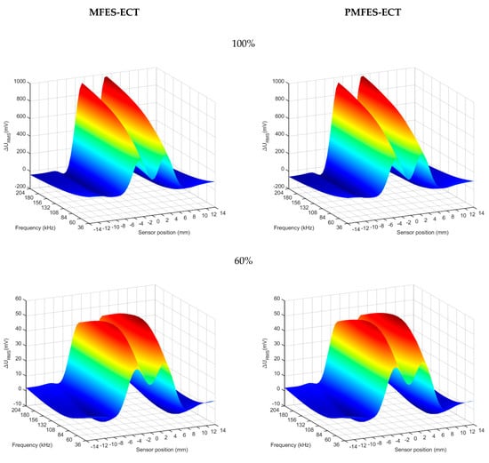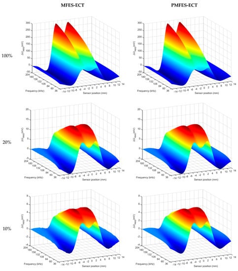 This section presents simulation results that allow us to compare both methods: PMFES-ECT and MFES-ECT. The simulations were performed for various depths of flaws, according to Section 3. Figure 13 shows the comparison of the spectrograms achieved from the MFES-ECT and PMFES-ECT methods for various flaw depths.