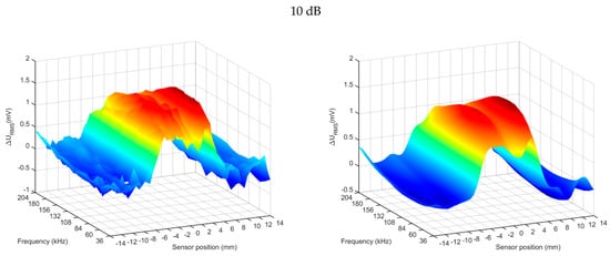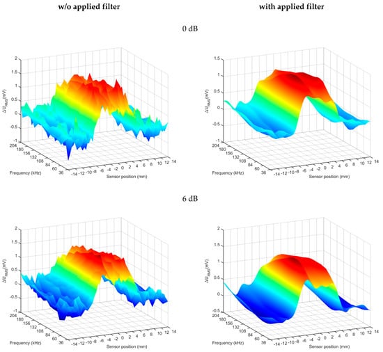 In the case of the deepest laying flaw (relative depth of 10%), a series of measurements were performed with a different pulse power value. The 0 dB reference value has been established on the level of previous measurements for the 10–100% defect depth. Additionally, the results were compared without and with the applied filter. The filter type is low-pass Butterworth and was applied to the generated spectrogram in the x (position) and f (frequency) domains. The results are shown in Figure 15.