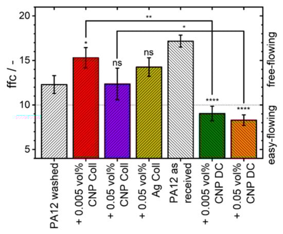 For instance, 0.005 vol% of CNP significantly increases the flowability of PA12 powder (*; ) when additivated with the colloidal approach, while dry coating significantly (****; ) lowers the free-flowing (ffc > 10) powder properties to easy-flowing (ffc < 10) [38]. An increase in the CNP dosage to 0.05 vol% does not impair the flowability by colloidal additivation, while dry coating further reduces the flowability of the powder. The poorer outcomes can be ascribed to the stronger mechanical forces during the dry coating process, which lead to an increased inter-particle cohesion due to fines [23,27]. Regardless of the additivation method, 0.05 vol% of CNP leads to poorer flowing powders than smaller quantities due to an increased amount of CNP agglomerates on the polymer particle surfaces [23]. In comparison, the colloidal additivation of the same amount of Ag-NP slightly increases (ns; ) the flowability. Based on these results, the colloidal additivation process is the more suitable option for the additivation of nanoparticles since the good flowability of the base powder material is maintained.