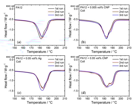Three heating curves of the LB-PBF-P specimens made of (a) pure PA12, (b) PA12 and 0.005 vol% carbon nanoparticles, (c) PA12 and 0.05 vol% silver nanoparticles, and (d) PA12 and 0.05 vol% carbon nanoparticles. The addition of the nanoparticles was performed via colloidal additivation. The heating rate was 10 K/min.