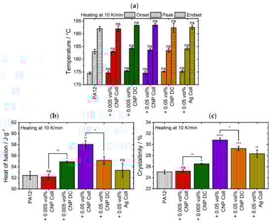 Since the second peak does not change the main peak positions, the temperature onset, peak, and endset do not change significantly (ns; ) by any additivation (Figure 3a). Yet, the overall crystallinity increases significantly for all additivated samples except for PA12 colloidally additivated with 0.005 vol% CNP (Figure 3c) due to the broadening of the second peak. The differences between the two additivation methods are more prominent for 0.005 vol% CNP (**; ) than for 0.05 vol% CNP (*; ). Therefore, an increase in crystallinity is not an initial indication of improved mechanical properties since the higher crystallinity values may come from an increased number of unmelted, but highly crystalline, polymer particles. Moreover, the results of the heat of fusion and crystallinity do not provide information about layer bonding. If an increase in crystallinity by nanoparticles has macroscopic advantages for the properties of the mechanical part, further analytic examinations are required. For instance, microscopic investigations need to be conducted to evaluate the connection between subsequent layers and the crystal growth behavior at these interfaces.