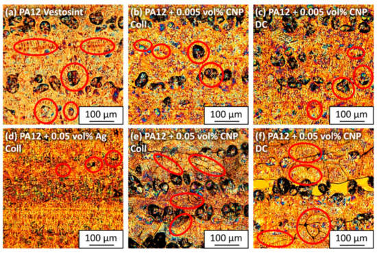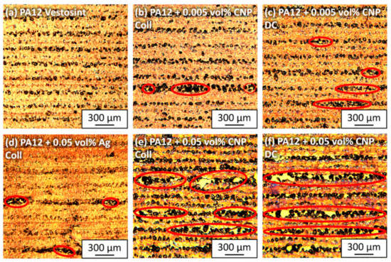 With microscopy images of higher magnification (Figure 5), lamellar structures can be identified. The typical crystalline structures of PA12 with lamellae up to 25 µm are visible, originating from unmelted particle cores or random impurities (Figure 5a). The dimensions of these lamellae, which develop during the cooling phase of LB-PBF, correlate well with the microscopic results of the calorimetric powder measurements [23] since their lengths lie between the values of the cooling rates at 0.5 K/min and 20 K/min. Spherical and ellipsoidal structures can be found, as observed in previous studies [23,25]. Adding 0.005 vol% CNP does not increase the frequency of crystalline structures, but seemingly reduces them. There are no apparent differences between the two additivation methods at this low dose of nanoparticles (Figure 5b,c). However, formations of agglomerated nanoparticles to chain-like structures (Figure 5e,f) can be identified at 0.05 vol% CNP. Even though the nanoparticles occasionally induce lamellar growth across layer boundaries, they also introduce new interfaces that predetermine mechanical weak points. While there are larger CNP clusters in the dry-coated specimens, the colloidal additivation leads to a more homogeneous distribution of the CNP in the melt. It is expected that dry-coated samples will have poorer mechanical properties due to the higher frequency of clusters. The lamellar structures cannot be identified in the PA12 sample with 0.05 vol% Ag-NP (Figure 5d). Only crystalline growth from unmelted particles can be found. As expected from the thermal powder analyses [20], no nucleation effects of the Ag-NP can be detected by microscopic evaluations. However, both microscopic and DSC evaluations are limited as they only represent a small percentage of the total sample. Three-dimensional analysis methods, such as µ-CT (see Section 3.8), can help to better understand the internal structures of the entire sample.