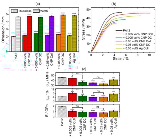 The overview of the tensile test results shows the LB-PBF-P specimens of different material compositions with regard to their (a) measured dimensions, (b) exemplary stress–strain curves, and (c) mechanical properties of the ultimate tensile strength (), ultimate elongation ( ) and Young’s modulus ( ). The level of significance increases with the number of asterisks, while “ns” stands for an insignificant difference.