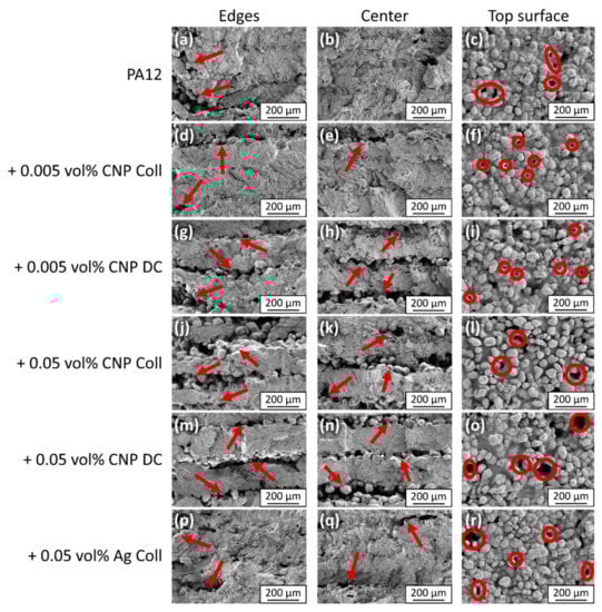 Collection of scanning electron microscopy images of the fractured surfaces of the tensile bars and of the top surface of the specimens. The left column (a,d,g,j,m,p) depicts the edges, and the middle column (b,e,h,k,n,q) shows the center of the fractured surface. The condition of the specimens’ top surface can be seen in the right column (c,f,i,l,o,r). The quantity of nanoparticles increases from top to bottom. Exemplarily, the red arrows mark unmelted polymer particles, while the red circles highlight voids.
