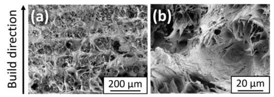 (a) Scanning electron microscopy images of the ductile area of fractured surfaces of the PA12 specimens. A more detailed view of the spherical fibrillated structures responsible for the ductility can be seen in (b).