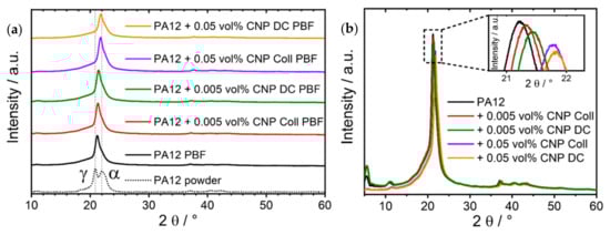 Diffraction patterns of the specimen produced from the different composite powders in comparison to PA12 powder are depicted in Figure 9 below. The experimental pattern could be described solely by the presence of a crystalline monoclinic (pseudohexagonal) γ PA12 phase when taking the structural data reported by Cojazzi et al. [51] and a polynomial background function into account, i.e., there are no indications of the presence of another crystalline PA12 phase. The specimens were produced by LB-PBF-P, i.e., the powder was first melted and then allowed to cool at relatively moderate cooling rates. At these conditions, i.e., the crystallization of PA12 from the melt, the γ form was previously reported to be formed [50]; however, also in LB-PBF-produced specimens, an intermediate structure between the α and γ phase was recently reported to be present in the precipitated feedstock [26]. Consequently, despite an apparent shift of the main reflex of less than 1° (Figure 9b), we can also confirm that under the chosen conditions, the CNP present in the composite powder do not trigger the nucleation of PA12 polymorphs other than γ in the built specimens. The unit cell parameters for the γ PA12 phase deduced by Rietveld refinement of the experimental diffraction pattern are summarized in Table 2. No trend indicating a dependence of unit-cell parameters or lattice spacings (Table S3) on any amount of NP present in the powder system could be deduced.
