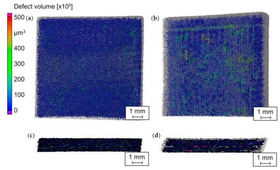 After the scan, the images were reconstructed and loaded into the VGStudio Max 2.2 analysis and visualization software (Volume Graphics GmbH, Heidelberg, Germany). Afterwards, algorithm-specific voxels were characterized with the “VGDefX (v2.2)” as defects based on their grey value compared to a defined local threshold for contrast. The theoretical resolution of the system is 3 µm; however, due to the dimensions of the specimens, the minimum accurate detectable pore size increased to 15 µm. By setting the minimum pore size in the defect analysis program according to the effective pixel size of the specimens (15 µm) and checking the detected probability of the detected pores, the pores could be distinguished from the noise.