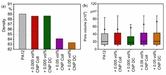 Figure 11b shows the size distribution, average pore size, and the pore counts within each specimen. In most of the specimens, pore volumes lay between 10 × 104 µm3 and 85 × 104 µm3. The average pore volume also increases as the quantity of CNP in the PA12 specimens increases. The colloidal additivation of 0.005 vol% CNP reduces the maximum pore size of PA12 from 85 × 104 µm3 to 69 × 104 µm3, while the dry coating method and higher amounts of CNP increase the maximum pore size by 5 × 104 µm3. Therefore, lower quantities of CNP are less detrimental for the density of parts, in which case the dispersion of the nanoparticles plays a crucial role in the final part properties.