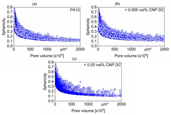 Sphericity measurements of the pores in specimens of (a) pure PA12, (b) PA12 dry-coated with 0.005 vol% CNP and (c) PA12 dry-coated with 0.05 vol% CNP.