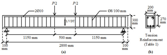 Reinforcement details and dimensions of the test beams. (a) Elevation and (b) cross-section.