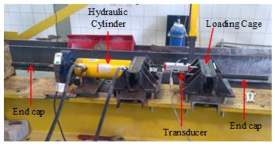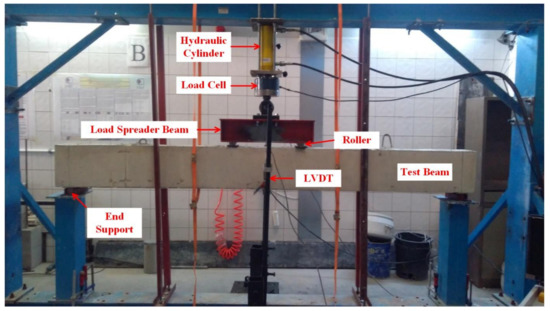 The test beams were simply supported at the ends and subjected to two-point loading (Figure 1 and Figure 3). Each loading point was at a distance of 1150 mm from the end support, leaving a distance of 500 mm between the loading points. The clear distance between the end supports was 2800 mm (Figure 1). The vertical deflections at mid-span were measured with the help of two LVDTs, connected to the front and rear faces of the beam. In this way, the twisting rotations in the beam during loading were attempted to be detected in the case of any undesired eccentricities in the applied load. The mid-span deflections were calculated from the average of the measured values from the two LVDTs. The load measurements from the load cell and the deflection measurements from the LVDTs were acquired by a data acquisition system and saved to a computer.