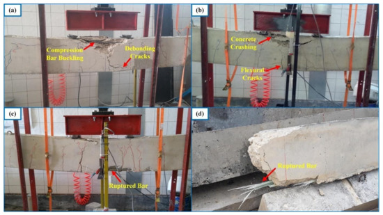 Failure modes of the specimens: compression failure (a) in the presence of compression bars; (b) in the absence of compression bars; (c) tension failure; and (d) ruptured bar.