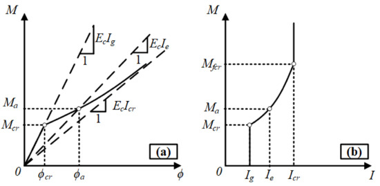 (a) Moment–curvature (M–ϕ) relationship of a typical RC beam with tension-controlled behavior [33]. (b) Variation of moment of inertia with applied moment for the same beam.