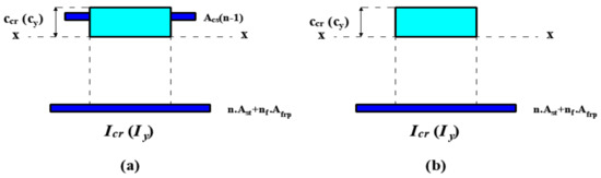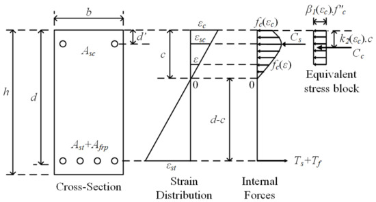 where n and nf are the modular ratios of the steel and FRP bars, respectively, to concrete; Ast, Afrp, and Asc correspond to the areas of the tension steel, tension FRP, and compression steel reinforcement, respectively; and d and d′ correspond to the effective depths of the tension and compression reinforcement.