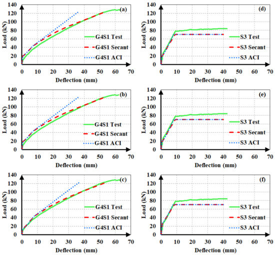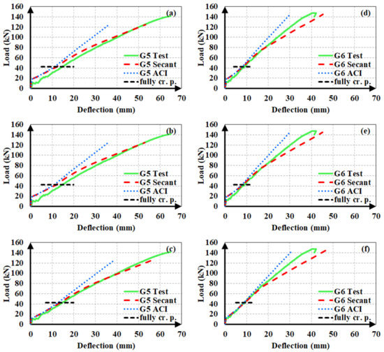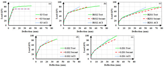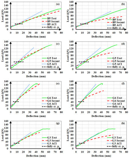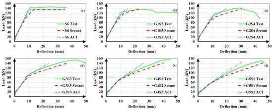 where L and Lss correspond to the total and shear span lengths of the beam, i.e., 2800 and 1150 mm, respectively. I in this equation corresponds to the uncracked value (Iucr or Ig) before Ma reaches Mcr. Beyond Mcr, Ie is used in the equation. Finally, E was obtained from the ACI 318M-19 [32] or secant modulus definitions, summarized in Section 6.2, in the respective load-deflection curves.