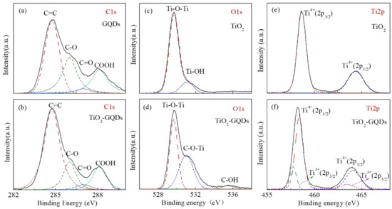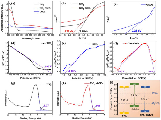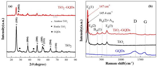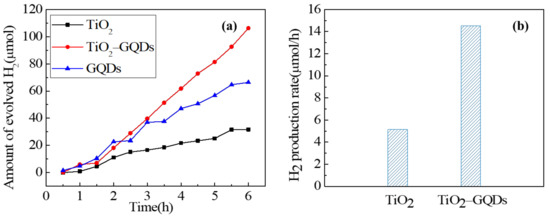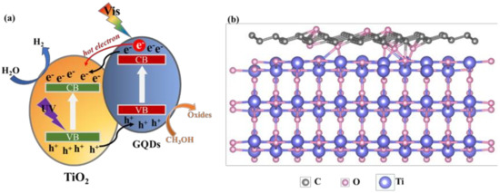 - Min, S.; Hou, J.; Lei, Y.; Ma, X.; Lu, G. Facile one-step hydrothermal synthesis toward strongly coupled TiO2/graphene quantum dots photocatalysts for efficient hydrogen evolution. Appl. Surf. Sci. 2017, 396, 1375–1382. [Google Scholar] [CrossRef] [Green Version]