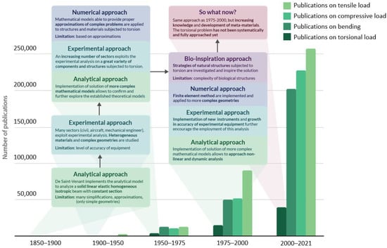 The infographic presents the evolution in approaching the torsional problem across years and the occurrence of publications dedicated to torsional analysis from 1850 until today. For each period, the comparison of torsional works with the papers dedicated to other commonly applied loads (tension, compression, and bending) is reported. The green boxes focus on the evolution of the analytical approach and their limitations; the light-blue boxes refer to issues related to the experimental approach. Violet boxes are dedicated to observations concerning the numerical approach, while the purple rectangle concerns bio-inspiration strategies. In pink, the latest trends in addressing the torsional problem are reported.