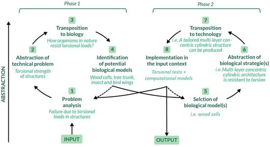 A schematization of the process model of biomimetics to address the torsional issue is presented. It is divided into two phases and eight steps: each of these steps takes advantage from specific tools such as problem analysis, abstraction, transposition, etc. [99,108]. Adapted with permission from [99].