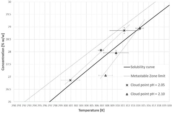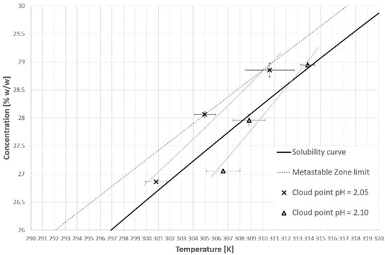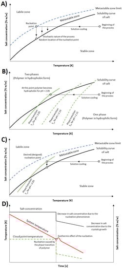The authors of this research are aware that the crystallization phenomenon may be influenced by multiple factors like stirring speed, cooling rate, etc. Therefore, in order to purely understand the mechanism of the proposed process, it was decided to focus only on the concentration of salt, since it would change during the process course, and the pH of the solution, which directly controlled the value of the cloud point temperature. The rest of the parameters were constant in all measurements.