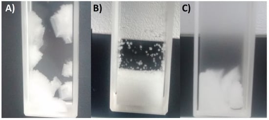 Figure 2 presents the photographs of crystals from the initial stage of the research. When the crystallization was performed without any mixing large, aggregated crystals were obtained, often attached to the walls of the cuvette (Figure 2A). In order to prevent a situation in which the optical path would not be obscured by the crystals, we have used a 7 mm magnetic stirrer placed within the vessel. The mixing speed was established based on the stability of the absorbance readings (Figure 3) when crystals were present in the sample; 1000 RPM mixing provided full homogenization of the suspension. Of course, as one could expect, the hydrodynamic conditions had to affect the crystal size distribution. Significantly smaller particles were created. However, after careful examination, one can notice that still small part of the crystals was attached to the walls of the cuvette (Figure 2B). The situation changed when the samples with PAA addition were crystallized (Figure 2C). As in the case of pure KCl solution without mixing large crystals were obtained. Yet it needs to be emphasized that none of them were attached to the walls of the cuvette. Additionally, Figure 2C demonstrates the turbidity of the solution resulting from the presence of hydrophobic particles of PAA. As it was proven in our previous research [38], PAA macromolecules are extremely sensitive to the change of pH. In order to fit the TCP for a given salt concentration, the pH value has to be adjusted.