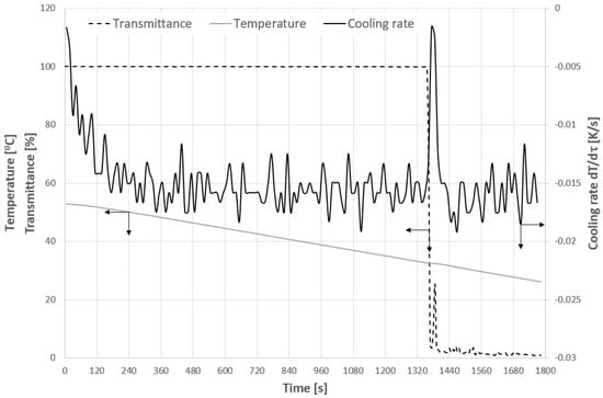 Figure 3 presents the exemplary measurements of the crystallization process at the initial stage of the research. During the cooling process the temperature of the sample and the cuvette holder, as well as the transmittance of the sample, were measured. The rise of temperature during nucleation, which is an exothermic process, was relatively small. Since we wanted to eliminate the “human factor” for the assessment of nucleation point it was determined based on the cooling rate value which was calculated as the numerical time derivative of temperature. Of course, as one should expect due to the intense mixing, the nucleation also resulted in a sudden transmittance drop. This graph is presented to demonstrate the method of distinguishing between the transmittance drop due to the nucleation and due to the polymer transition. In the second case, the change was not accompanied by the change in the cooling rate. Therefore, the nucleation point could be precisely determined even in the middle of polymer phase transition. It is also worth mentioning that our previous research [38,55] proved that the phase transition of PAA is less drastic in comparison to the sudden drop of transmittance in the case of LCST type polymers. It will be visible in the discussion of the following results. At this point, the authors would like to strongly emphasize that although the crystallization was realized within a cuvette placed in a spectrometer the process was investigated using the commonly acknowledged polythermal method. The transmittance measurements were necessary in order to detect phase transition of polymer. It is also worth noticing that the presented research fits well with the idea of PAT, i.e., analysis of the phenomenon using multiple measurement techniques. The nucleation point could be detected using two independent stimuli. In all experiments a small time delay was noticed between the change of transmittance and temperature. It resulted from several reasons. Firstly, to detect the temperature rise in sample the temperature of the sensor had to be equalized with a temperature of suspension. This process was significantly slower compared with the measurement of light transmittance. Secondly, to determine the time derivative of temperature, a numerical method was used in which given time step had to be used. Simultaneously one has to remember that the temperature change occurred within the whole volume of the sample, whereas to detect the transmittance change the crystals had to appear directly in the path of the light.