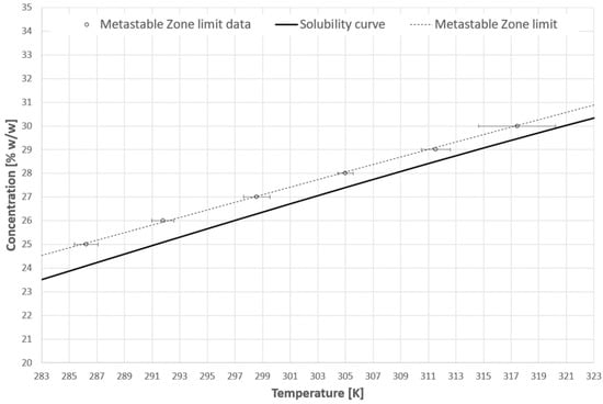 The first task was to determine the metastable zone width using the polythermal method. The results are presented in Figure 4. The solubility curve was taken from the literature [56]. It is represented by the following equation: