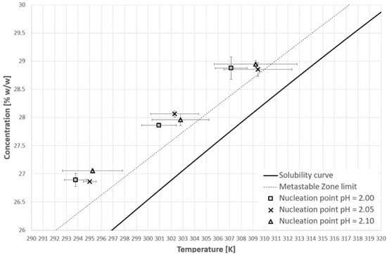 Figure 7 and Figure 8 represent the nucleation points for the first and second cooling cycle, respectively. Unfortunately, these results completely disprove our research hypothesis. As one may notice in all cases (TCP below solubility curve—pH = 2.10; TCP within the metastable zone—pH = 2.05; no phase transition—pH = 2.00) the nucleation points are well beyond the metastable zone determined for the pure KCl solution. It seems that the state of macromolecules had no greater impact on that phenomenon. What is more, the alteration of the process negatively influences its randomness. The dispersity of the results was higher compared to the pure solution, especially in the case of the second cooling cycle. What is interesting is that the maximal value of supercooling is noticeably higher compared to the initial results (Table 1 and Table 2).
