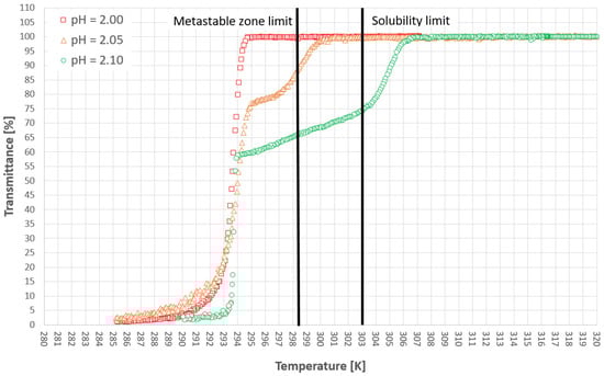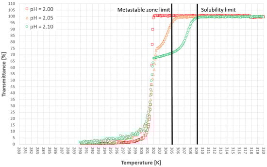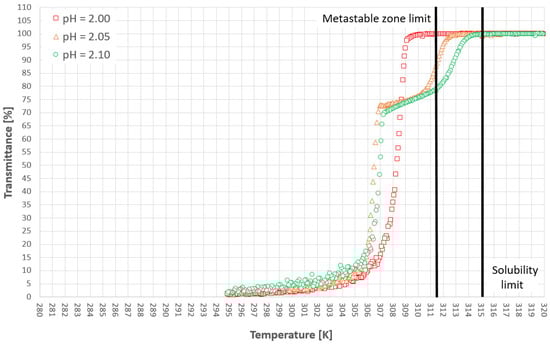 Figure 9, Figure 10 and Figure 11 present selected results from our experiments for KCl concentration equal to 27, 28, and 29% w/w, respectively, for the first cooling cycle. We would like to emphasize that these data were selected from a significant number of measurements which were characterized by noticeable dispersity of points as shown in Figure 7. However, we would like to depict an interesting behavior of the system. It was noticed that for each concentration one could easily find the set of process courses for which the nucleation point appeared at a very similar temperature. Several conclusions may be made from this observation. Firstly, the state of macromolecules (hydrophilicity/hydrophobicity) has no impact on the process. It seems that the hydrophobic particles of PAA are invisible from the nucleation point of view. Moreover, the very fact of the phase transition did not destabilize the system as it was assumed in the presented research hypothesis. The nucleation point appeared for a specific temperature, no matter how fast the cloud point occurred during the cooling of the solution. Secondly, in the investigated range of pH values, the acidity of the solution had no clear impact on the MZW. As one may notice in Figure 7, Figure 8, Figure 9, Figure 10 and Figure 11, the ranges of results for each pH overlap. The mechanism of this phenomenon is not clear. For example, if the macromolecules of PAA would inhibit the creation of the crystal nucleus then the point of phase transition had to influence the time needed for nucleation. This was noticed in the presented research. On the other hand, the interaction between KCl ions and PAA macromolecules is the basic condition of the polymer’s thermosensitivity. Perhaps, the action of PAA is bidirectional? This means that the phase transition of polymer initializes the formation of crystals nucleus; however, their growth is hampered or stopped by the formation of a buffer layer composed of polymer chains. Therefore, until a critical supercooling is not reached no crystal entities may be created.