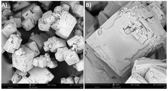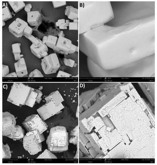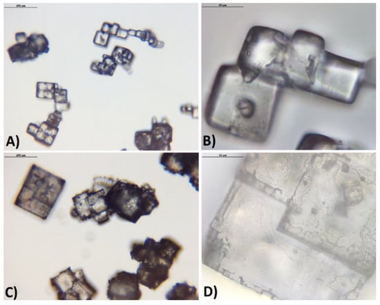 Crystals that in part resemble those received by us were presented by Rohani and Ng [44]. They were created in the presence of silica powder. Authors concluded that small, insoluble particles promoted the formation of rough surfaces. In order to investigate this phenomenon further, the growth of crystals in both cases was recorded. They are attached as Supplementary Materials to this paper. In the case of a pure solution, one may notice that growth was towards the diagonals of the crystal. The center of each wall remained empty for a long time. The crystalline matter filled the cavities at the later stages of crystal growth which resulted in the hopper-cubic shape. However, in the second case, the growth of each wall was smooth and uniform which led to the formation of sharp-edged crystals.