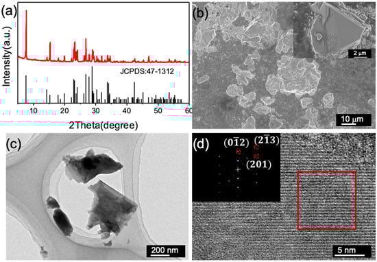 XRD patterns (a), SEM image (b), TEM image (c), and (d) HRTEM image and FFT pattern (inset) of the Cr8O21 powder.