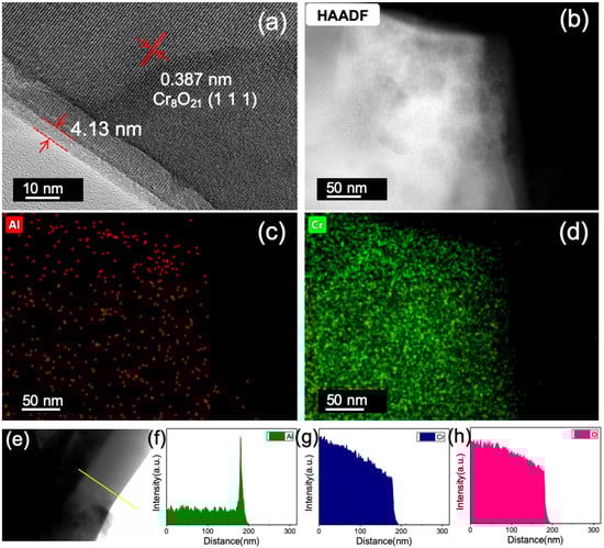 The TEM observation reveals the formation of an amorphous Al2O3 coating layer on the surface of the Cr8O21 particle (Figure 2a, taking the 12 ALD sample as an example) [29,30,31]. The HRTEM shows that the Al2O3 layer has a noncrystalline structure [29], while the Cr8O21 particle shows clear crystalline patterns. The thickness of the Al2O3 layer is approximately 4.13 nm. In the ALD process, the Al2O3 layer thickness can reach 1 nm per 3 cycles (The thickness calibration results by AFM are shown in Figure S3 and Figure S4). Therefore, the thickness of the Al2O3 layer of the 12 ALD cycles sample must be approximately 4 nm, in accordance with the TEM observation. The lattice fringe of the particle core is 0.387 nm, which corresponds to the (1 1 1) planes of Cr8O21. It is also shown that the crystal structure of Cr8O21 is not affected by the ALD coating process, which can be confirmed by XRD results of the Cr8O21 electrodes with different ALD cycles (Figure S5). EDS mapping of TEM (Figure 2b–d) clearly shows that the aluminum atoms are uniformly distributed on the surface of the Cr8O21 particle, indicating that the Al2O3 ALD membrane is uniformly coated on the surface of the Cr8O21 electrode. The line scan in Figure 2e–h indicates an aluminum-rich layer at the surface of the particle, which corresponds to the thickness of the Al2O3 ALD layer.