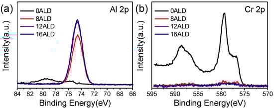 XPS spectra of (a) Al 2p, (b) Cr 2p with different coating cycle numbers (0, 8, 12, 16).