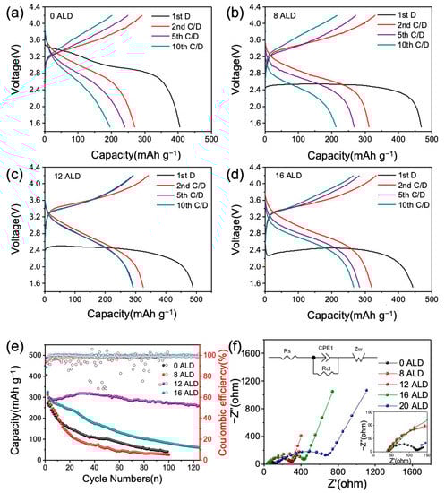 The effect of resistance on discharge performance was further verified by EIS tests, as shown in Figure 4f and Table 1. The equivalent circuit model of EIS analysis is displayed in Figure 4f. All EIS curves consist of a semicircle in a high-frequency range and an inclined straight line in a low-frequency range. It can be seen that the Al2O3 coating layer does not affect the electrochemical reaction process, which is the same as the previous report [53]. The depressed semicircle in the high-frequency region is assigned to the charge transfer process (Rct), and the inclined line in the low-frequency region is related to the Li-ion diffusion resistance (Zw). Figure 4f and Table 1 indicate that when the ALD coating cycles were less than 20, all the Rs (series ohmic resistances) were approximately 42 Ω. This shows that thin ALD coating has little effect on Rs. The slight change in Rs may be caused by the difference in the preparation process of the coin cells. For the electrodes with ALD coating cycles of more than 16, increasing the thickness of ALD coating obviously leads to the increase in Rs. The Rct increases obviously with the increase in the number of ALD coating cycles. For the electrode without ALD coating, the Rct is 79.2 Ω. When eight cycles of ALD were coated on the electrode, Rct increased to 252.9 Ω. Continually increases the ALD coating cycles to 20, Rct reaches an amazing value of 660.9 Ω. The large resistance of the 20-ALD-coated electrode prevents it from releasing any capacity. The result is consistent with the variation of the first discharge plateau. Table 1 and Figure S10 also show that the 0 ALD electrode has minimum Warburg coefficient (σ) [54], on the other hand, of all ALD-coated electrodes, 12 ALD electrode has a minimum Warburg coefficient (σ), which is consistent with the results of electrochemical performance tests.