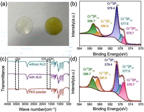 (a) Macrographs of PEO membranes contacted with Cr8O21 electrodes (with 12 ALD (left) and without ALD (right)) at 60 °C for 7 days; (b) Cr 2p XPS spectra of pristine Cr8O21 electrodes; (c) FTIR spectra of three types of PEO (without ALD, with ALD and PEO powder); (d) Cr 2p XPS spectra of the Cr8O21 electrode contacting with PEO membranes.