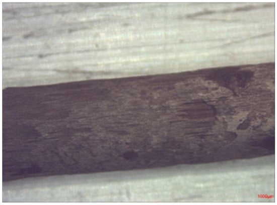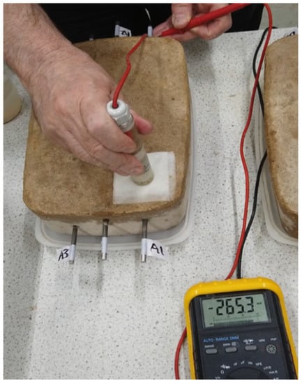 Potential mapping is a common method used in the field [12,13,14]. The assumption made is that more negative values of potential (voltage) indicate a greater risk of corrosion, while less negative values of potential indicate a lower risk of corrosion. Before starting the measurements, the surface of concrete was wetted with a damp pad, as shown below in Figure 2. The reference electrode and bar were then connected to the negative and positive inputs of a digital voltmeter (DVM), respectively, and the potential was measured in millivolts DC. Three positions were measured above each bar. As each sample has three bars at different depths, nine values were collected from each sample (Table 1).