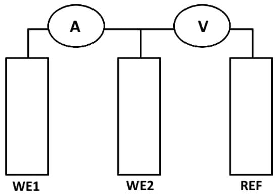 The ENM system employed in this work always uses three electrode connections. The method involves the measurements of the small fluctuations in current signals that are created between two nominally identical electrodes, and the voltage signals that are generated between the reference electrode and the working electrodes. This is shown in Figure 3 and the method as applied to corrosion in solutions is described in ASTM G199 [15]. In the most common (Bridge) arrangement, there are two corroding ‘working electrodes’ (WE1, WE2) and a reference electrode (REF). If measuring in concrete or mortar, WE1 and WE2 are two reinforcement bars and WE3 is the probe, which is on the outside of the concrete above the two bars.