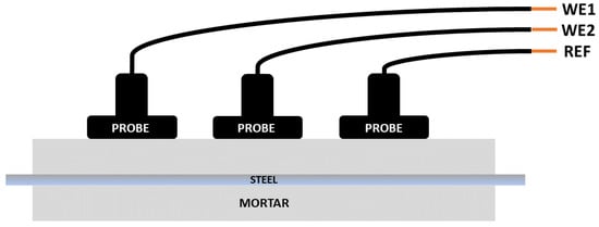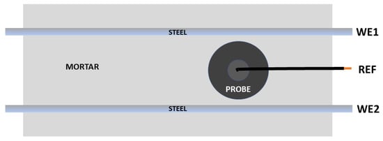 As discussed earlier, the traditional arrangement for making ENM measurements (bridge mode) requires two nominally identical electrodes (WE1 and WE2) being interrogated at the same time, hence an electrical connection has to be made to two separate bars as shown in Figure 4. In the SSS mode shown in Figure 5, connection is only made to one bar (which becomes the pseudo reference) and the information obtained comes from just that one bar. The WEs in this mode become the two probes. In the NOCS mode shown in Figure 6, three probes (two of them acting as WEs and the other acting as REF) are used situated above one bar and there is no need to connect to the bar at all, which is a distinct advantage for field applications. One practical point is that the probes in SSS and NOCS mode should be placed at least three times the distance apart of the cover depth to avoid short circuiting [4].