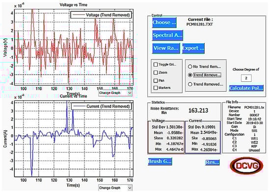 It has been shown that Rn can be considered as equivalent to Rp [17]. Data treatment was sometimes required to obtain valid and accurate values of Rn. This might involve detrending, where any drift of the voltage or current is removed mathematically, or brushing, in which a limited section of the data set is selected to avoid jumps (but still sufficient to calculate Rn accurately), or both.