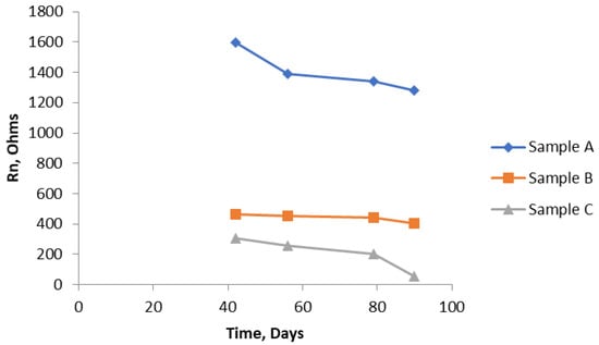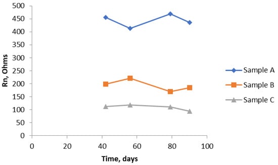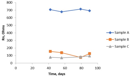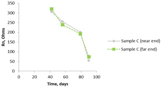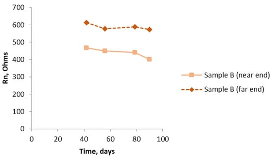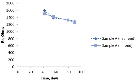 Graphical plots in Figure 9, Figure 10, Figure 11, Figure 12, Figure 13, Figure 14 and Figure 15 show the Rn values obtained. The data started being collected some way into the test period to allow some settling down. Figure 9 shows the trend downwards, but only slightly, of the values of Rn for Sample A and the results obtained when measuring at the two ends. There is excellent reproducibility and, as expected owing to the uniform nature of the composition of this sample, no significant difference between the two ends. Figure 10 shows a similar set of results for Sample B. Here, there is a distinct difference in the Rn results depending on which end of the sample was being interrogated (i.e., where the ref was located), with the end with chloride (near end) having significantly lower values of Rn. The overall values are less than they were for Sample A (about 1/3 to 1/4). Again, there is a moderate downward trend that is more noticeable in the end with chloride (note: the higher the Rn, the lower the corrosion rate).