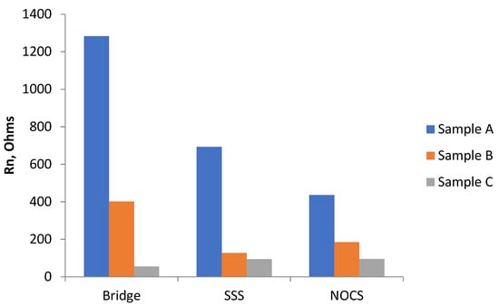Comparison of Rn from all three samples (A, B, and C) with the bridge arrangement.