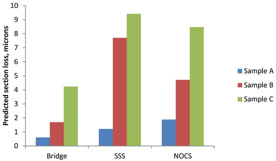 The bridge method gives the lowest results for section loss. SSS and NOCS give similar results, with Sample C (uniform 4% Cl−) being indicated as having the highest loss and Sample A (0%Cl−) having the lowest.