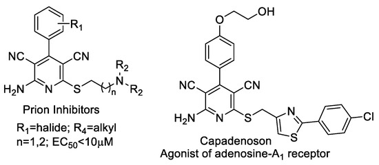 - Guo, K.; Mutter, R.; Heal, W.; Reddy, T.R.; Cope, H.; Pratt, S.; Thompson, M.J.; Chen, B. Synthesis and evaluation of a focused library of pyridine dicarbonitriles against prion disease. Eur. J. Med. Chem. 2008, 43, 93–106. [Google Scholar] [CrossRef]