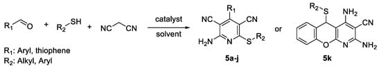 - Safaei-Ghomi, J.; Ghasemzadeh, M.A. CuI nanoparticles: A highly active and easily recyclable catalyst for the synthesis of 2-amino-3,5-dicyano-6-sulfanyl pyridines. J. Sulfur Chem. 2012, 34, 233–241. [Google Scholar] [CrossRef]