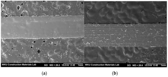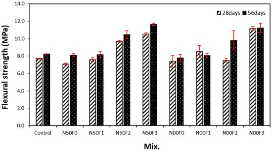 For 28 days of aging, the flexural strength of the mixtures using AMFs is 7.4–11.1 MPa, while for 56 days of aging, it is 8.10–11.6 MPa. The flexural strength increases with increasing age. Furthermore, the increase in flexural strength is higher for the sample using 20 kg/m3 or more AMFs than that for the sample using 10 kg/m3 AMF. In other words, for 56 days of aging, the flexural strength of the N50F1 and N00F1 samples using 10 kg/m3 AMF is approximately 8.1 MPa, which is approximately 0.6–3.8% higher than that of the sample without AMFs. On the other hand, the flexural strength of the N50F2 and N00F2 samples using 20 kg/m3 AMF is approximately 9.8–10.5 MPa, which is approximately 20.9–28.8% higher than that of the sample with 10 kg/m3 AMF. In addition, the 56-day flexural strength of the N50 samples using 50% natural aggregate is slightly higher than that of the N00 samples using 100% steel slag aggregate.