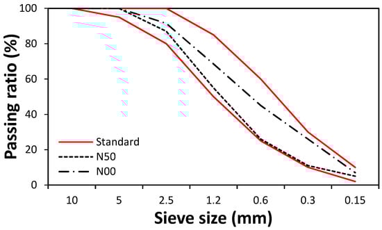 The experiments were conducted using N50 mixtures containing 50% natural fine aggregate (NS 50%, BS 25%, and FS 25%) and N00 mixtures containing no natural fine aggregate (NS 0%, BS 50%, and FS 50%). Figure 3 shows that the passing ratios of the N50 and N00 mixed aggregates are within the standard range.