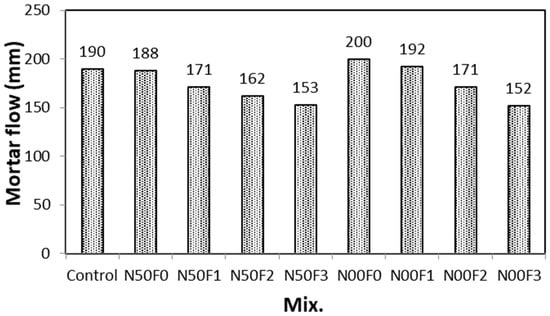 Figure 4 and Figure 5 show the change in flow with respect to the amount of AMFs in the mortar containing the steel slag aggregate. The flow of the control sample without the steel slag aggregate and AMFs is approximately 190 mm. As the amount of AMFs increases in the N50 and N00 mixtures, the mortar flow decreases. At the same amount of AMFs, the mortar flow of the N00 mixtures using only the steel slag aggregate is approximately 5.5–12.2% higher than that of the N50 mixtures using the 50% natural aggregate. This trend was also observed in the literature [19], where the workability of mortar using FS increased because the FS particles were coarser and the absorption rate was low.