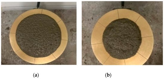 Mortar flow of (a) control (0 kg/m3 AMF) and (b) N00F3 (30 kg/m3 AMF) mixtures.