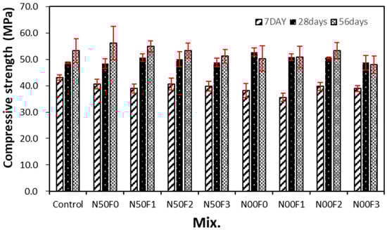 At 56 days of aging, the compressive strength of the control sample is approximately 53.2 MPa, and that of the N50F0 sample using 50% of natural fine aggregate and no AMFs is approximately 56.1 MPa, which is approximately 5.4% higher than that of the control sample. With the same amount of AMFs, the 56-day compressive strength of the N50 mixtures is slightly higher than that of the N00 mixtures.