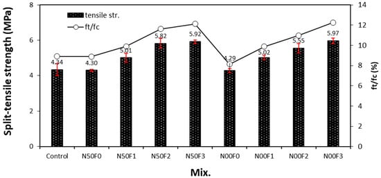 Figure 7 shows the change in the split-tensile strength with respect to the amount of AMFs in the mortar containing the steel slag aggregate. The 28-day tensile strength of the control sample is approximately 4.34 MPa, and those of the N50F0 and N00F0 samples without AMFs are approximately 4.29–4.30 MPa, similar to the tensile strength of the control sample. In addition, unlike the trend observed for the compressive strength, the tensile strength of all samples increases with increasing amount of AMFs.